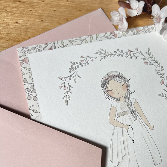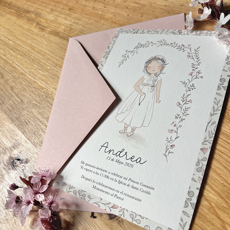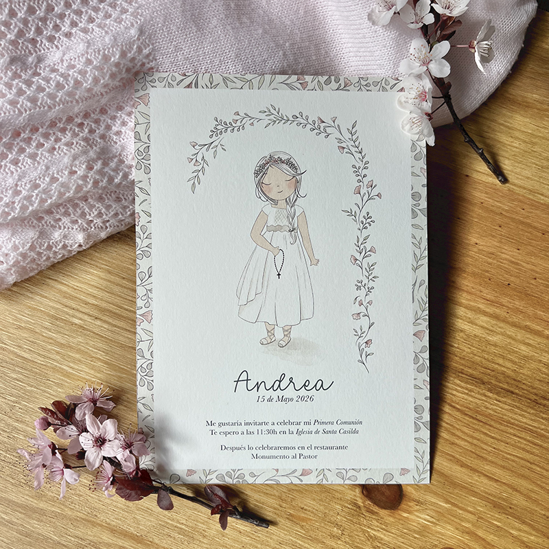 La invitación de Andrea con arco de flores es ideal para celebrar la primera comunión.
